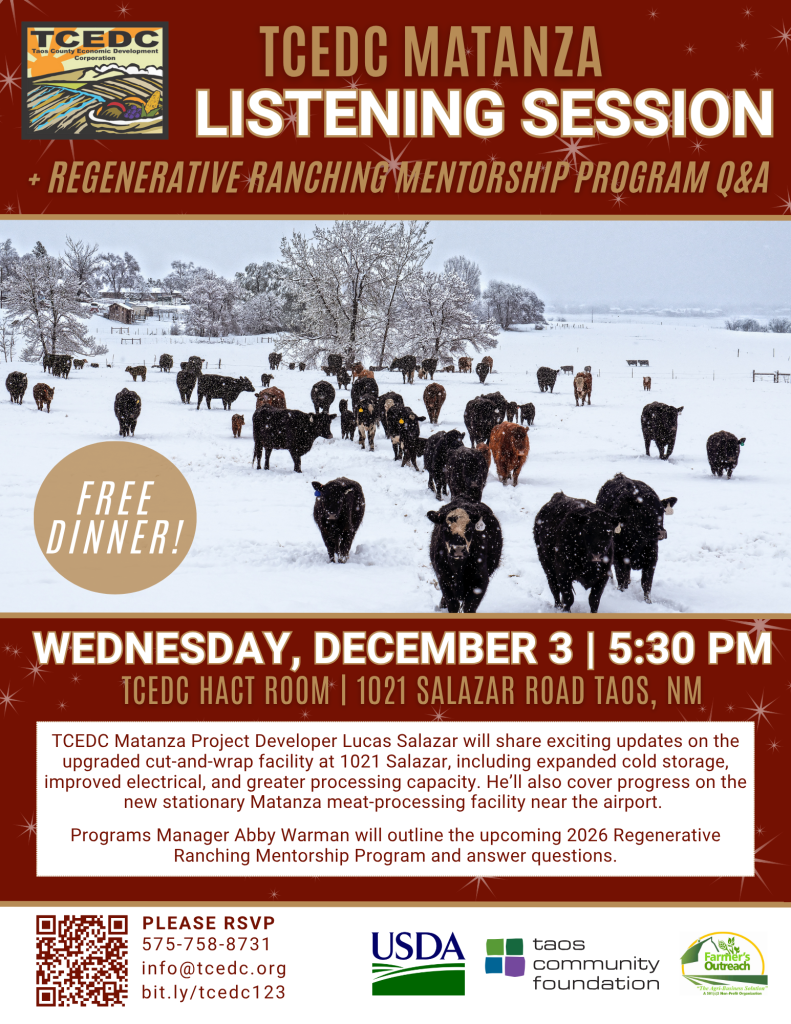 This event will be held in the TCEDC HACT Room (1021 Salazar Road, Taos), and a FREE dinner will be provided. Please RSVP online.
