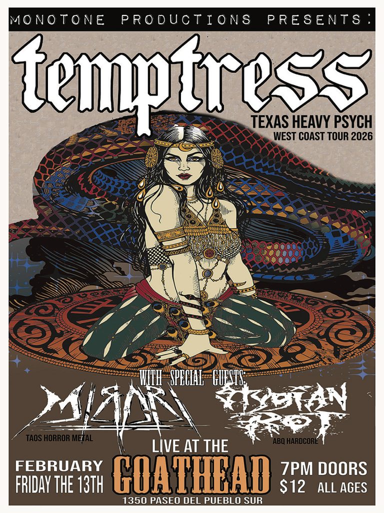 Dallas psych doom marauders TEMPTRESS is back and will be crushing the cursed Friday the 13th night with local djent badasses MIRARI along with blackened hardcore from Albuquerque STYGIAN ROT! $12 at the door, music starts at 8pm. ALL AGES live at The Goathead. Bad luck never sounded so brutal!