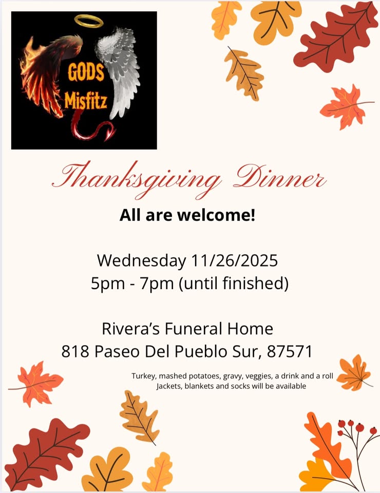 God’s Misfifz of Albuquerque is starting a monthly outreach in Taos. Their first Taos street outreach is Wednesday, November 26th. They will start serving at 5pm until the food all runs out.