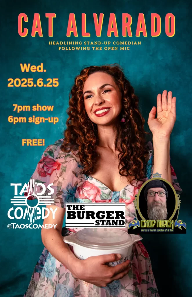 Cat Alvarado headlines TaosComedy's Burger Stand-up Comedy Open Mic
