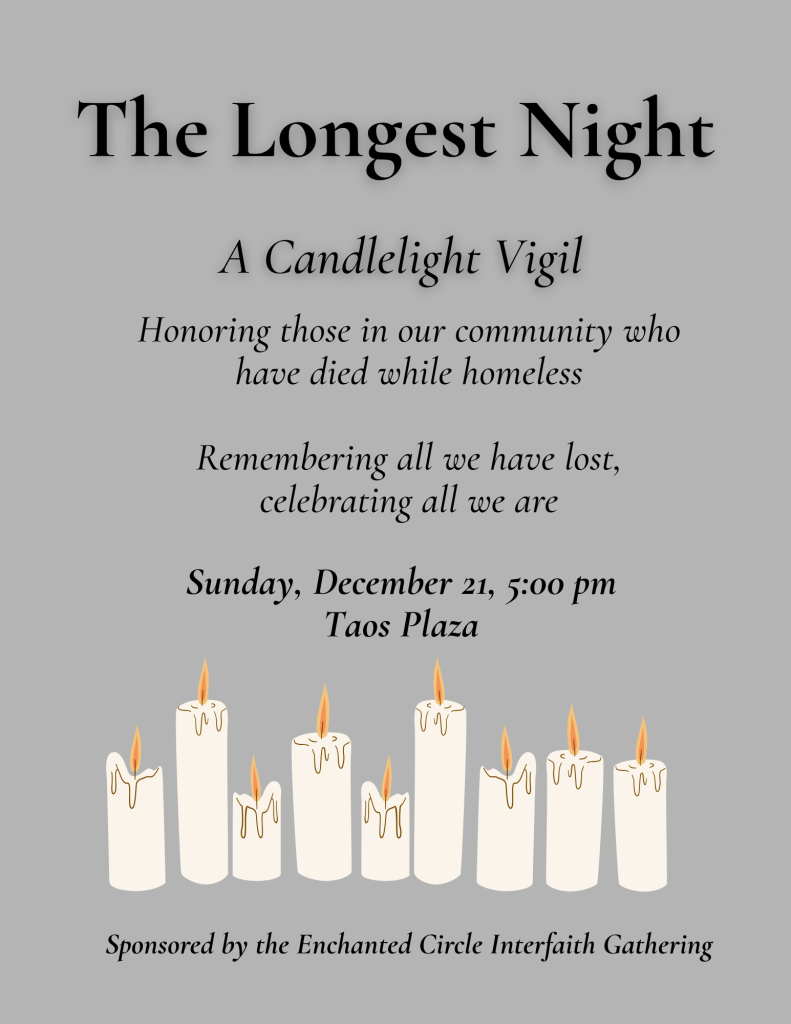 All are invited to participate in the 8th annual Longest Night vigil, in which we honor those in our community who have died without stable housing. In remembering those who have died while homeless, we commit ourselves to preventing the conditions that lead to such deaths and we rekindle our compassion and concern for all our siblings, especially those who are living without adequate housing. There will be a candle lighting, a brief service, and a processional to First Presbyterian Church, where all are invited to share a meal together.
