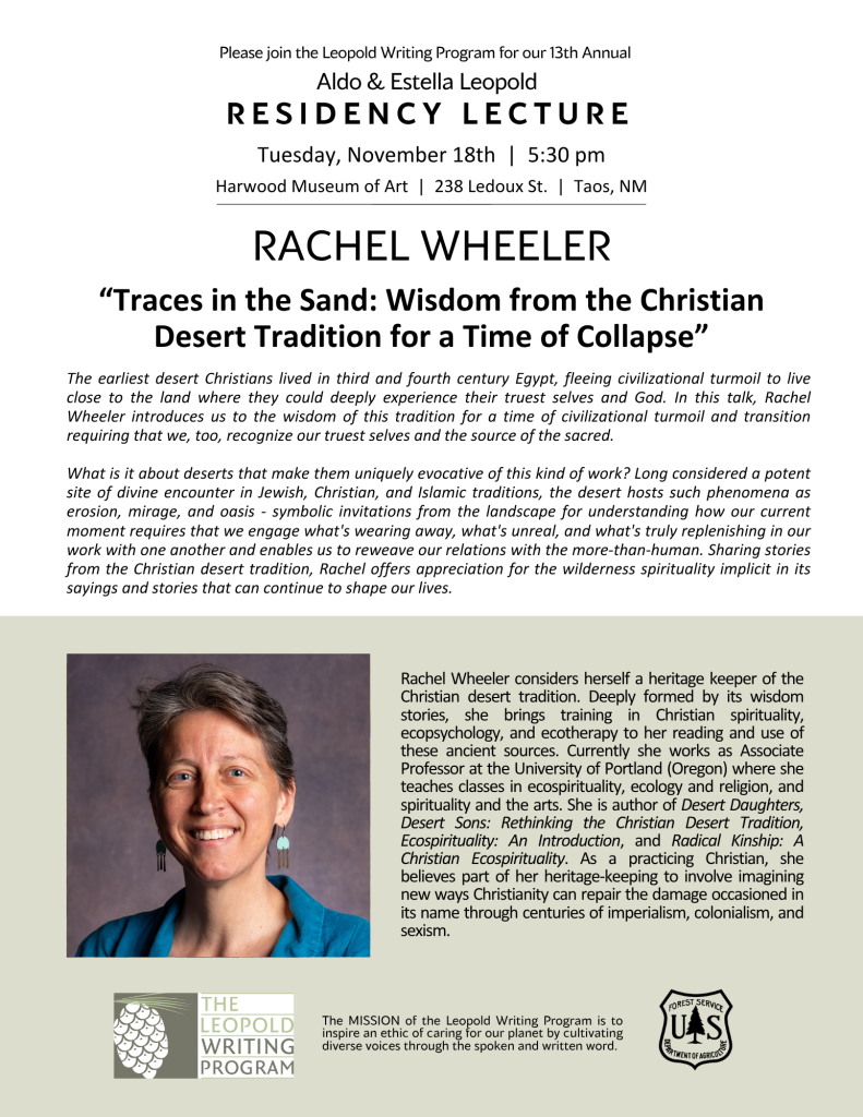 The earliest desert Christians lived in third and fourth century Egypt, fleeing civilizational turmoil to live close to the land where they could deeply experience their truest selves and God. In this talk, Rachel Wheeler introduces us to the wisdom of this tradition for a time of civilizational turmoil and transition requiring that we, too, recognize our truest selves and the source of the sacred. What is it about deserts that make them uniquely evocative of this kind of work? Sharing stories from the Christian desert tradition, Rachel offers appreciation for the wilderness spirituality implicit in its sayings and stories that can continue to shape our lives.