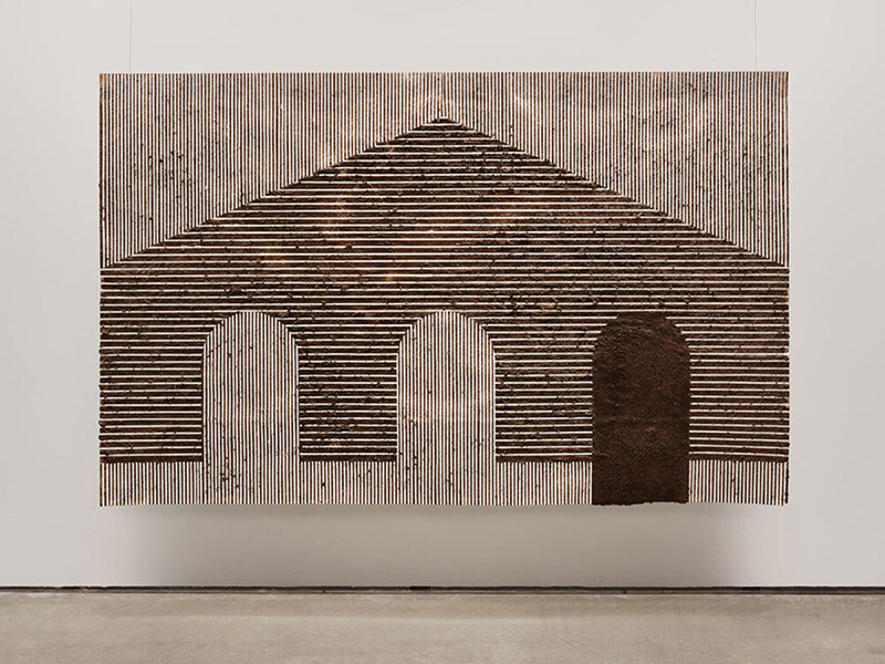 Image: Christine Howard Sandoval, Arch – A Passage Formed By A Curve, 2020, adobe mud and graphite on paper, 60 x 96 inches. Photo by Rachel Topham Photography.