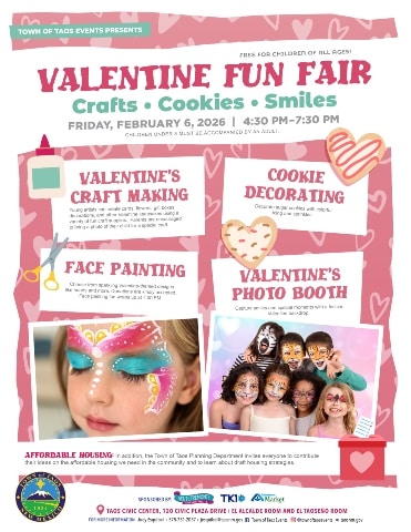Join Town of Taos Events for a free, family-friendly Valentine celebration on Friday, February 6, 2026, from 4:30–7:30 PM at the Taos Civic Center (El Alcalde & El Taoseño Rooms), 120 Civic Plaza Drive. Kids of all ages can enjoy Valentine crafts, cookie decorating, face painting (donations accepted; ends at 7:00 PM), and a Valentine-themed photo backdrop. Children under 8 must be accompanied by an adult.