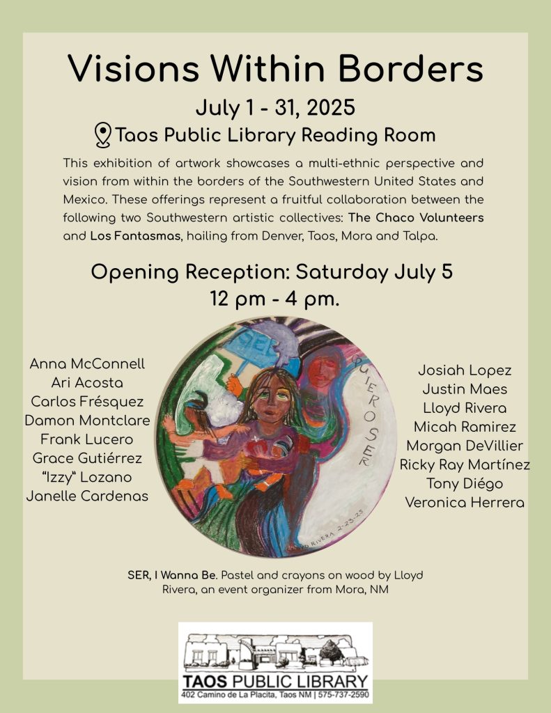 This exhibition of artwork showcases a multi-ethnic perspective and vision from within the borders of the Southwestern United States and Mexico. These offerings represent a fruitful collaboration between the following two Southwestern artistic collectives: The Chaco Volunteers and Los Fantasmas, hailing from Denver, Taos, Mora and Talpa. Exhibit runs July 1-31, 2025 at the Taos Public Library Reading Room.