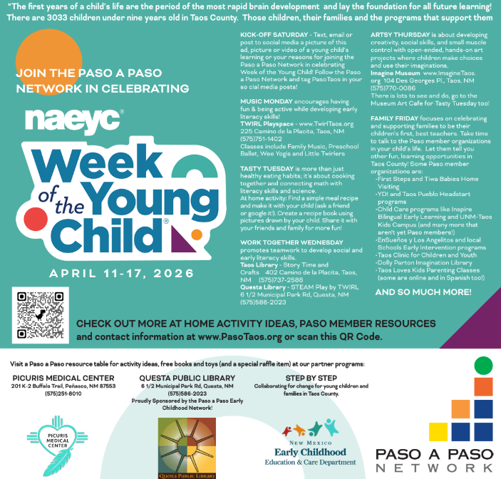 What young children are learning today lays the foundation for all future learning! Join the Paso a Paso Network to Celebrate the Week of the Young Child April 11-17. See daily fun activities that support learning and visit Paso tables for free books & toys at Questa Library & Picuris Medical Center. More information at www.PasoTaos.org.
