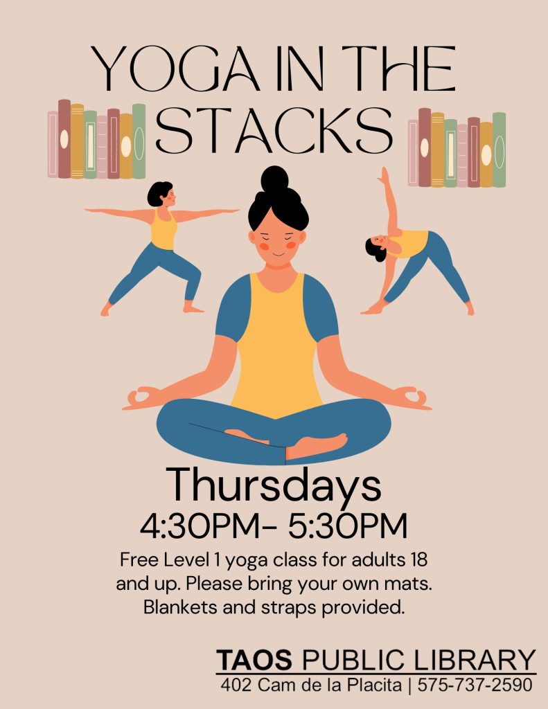 Yoga in the Stacks May 22, 2025 This event is over 6 months old, but I bet there is something great happening somewhere! View Current Taos Events! < Back to Events