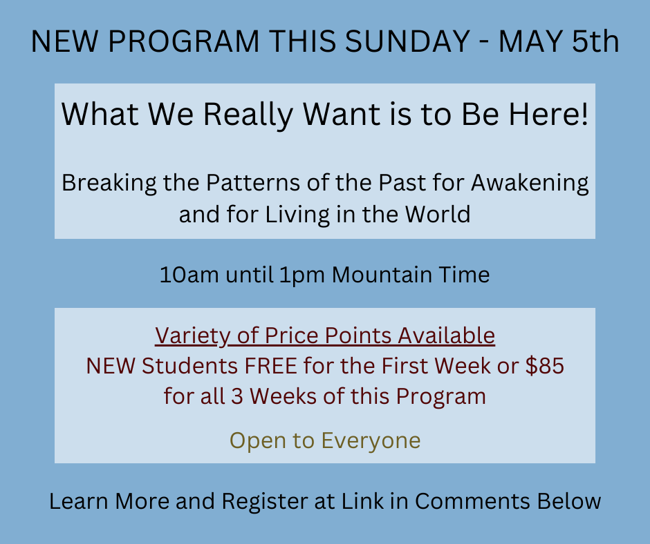 Registration is Open for Week 2 of Nothing Ever Happened! Suffering, NS, Your “Story” & How to Not Believe the Mind Saturday, May 7th 10am until 1pm Mountain Time Variety of Price Points Starting